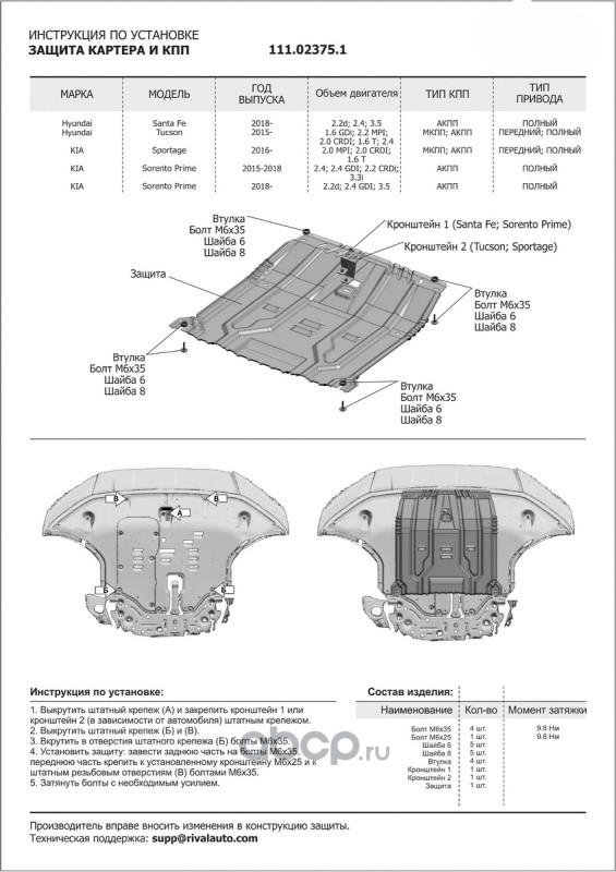 Описание: Hyundai Tucson 3 поколение 2015-2018 1.6 (132/177 л.с.), 2.0, 2.0D, Hyundai Tucson 3 поколение рестайлинг 2018-2021 1.6T GDI (177 л.с.), 2.0D, 2.4, c комплектом крепежа